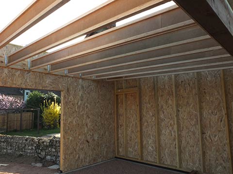 Puis les poutres qui vont soutenir le toit terrasse sont disposées… | |